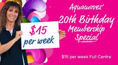 Aquamoves is celebrating 20 years with the return of an amazing membership special! Join now on a $15 per week Full Centre Membership with no lock-in contract!